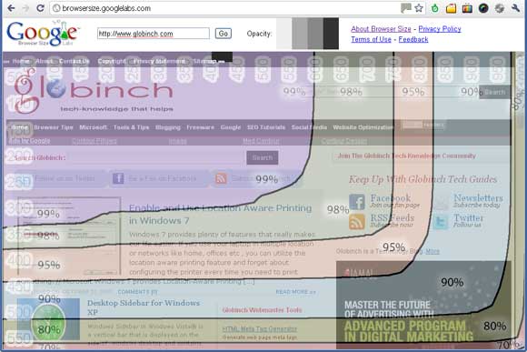 Google Browser Size is a visualization of browser window sizes for people who visit Google. This tool splits the web page into contours of different visibility. For example, the “80%” contour means that 80% of people visiting Google have their browser window open to at least this size or larger.